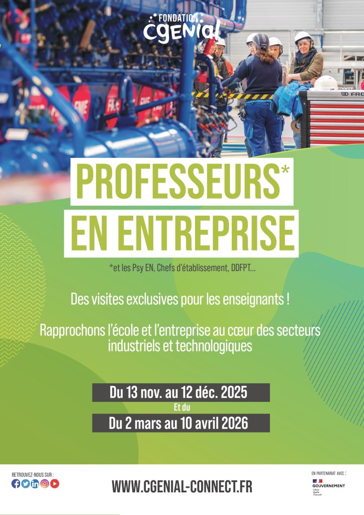 Dans ce cadre, le dispositif « Professeurs en entreprise » permet aux enseignants du secondaire et autres équipes de l’Education nationale de visiter des sites de production, d’innovation ou de recherche et développement afin de mieux connaître les enjeux des entreprises, leurs métiers, de tisser des liens et d’accompagner ainsi leurs élèves dans leur projet d’orientation.